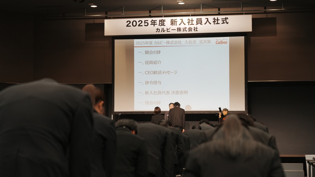 スナック菓子でおなじみのカルビー株式会社(以下、カルビー)でも、4月1日に入社式が行われ、希望に満ちた表情の新入社員108名が出席しました。