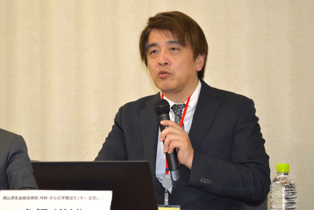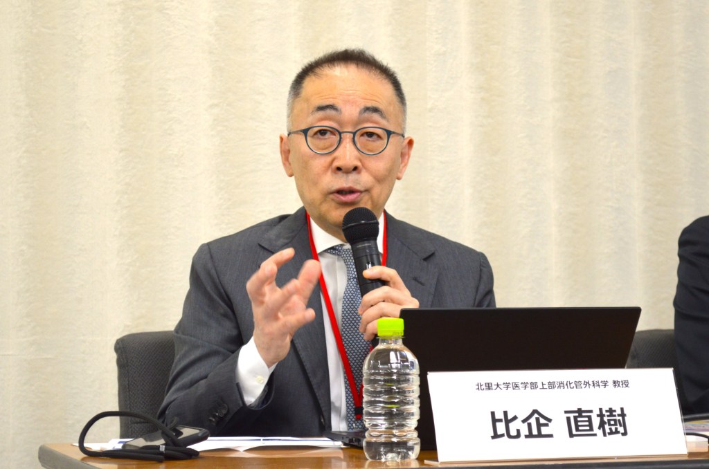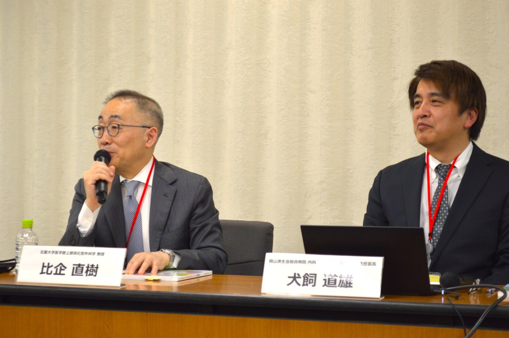 登壇したのは、同ガイドラインの編集・制作に関わった北里大学医学部 外科 上部消化管外科学の比企直樹主任教授と、岡山済生会総合病院 内科・がん化学療法センターの犬飼道雄主任医長。医療現場と患者の声をつなぐ「ペイシェントアドボカシー」の視点から、栄養治療の意義やガイドラインに込めた想いを語りました。
